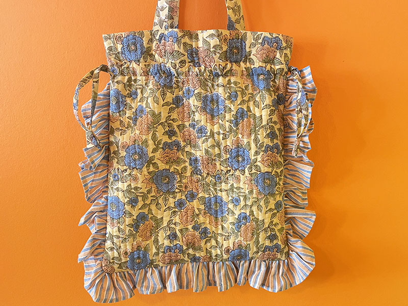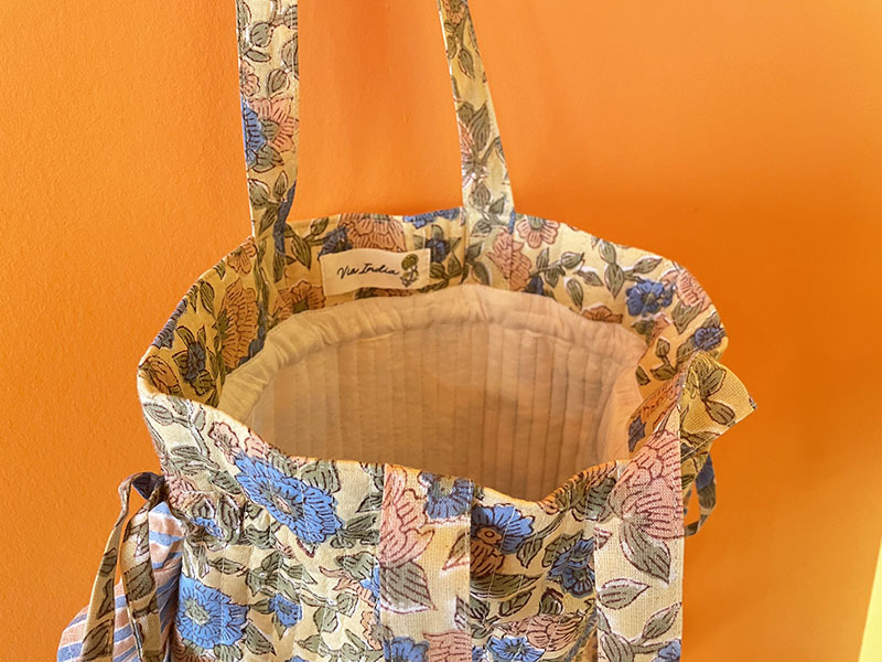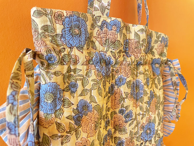 インド製のブロックプリントテキスタイルで作られた巾着型のトートバッグ。